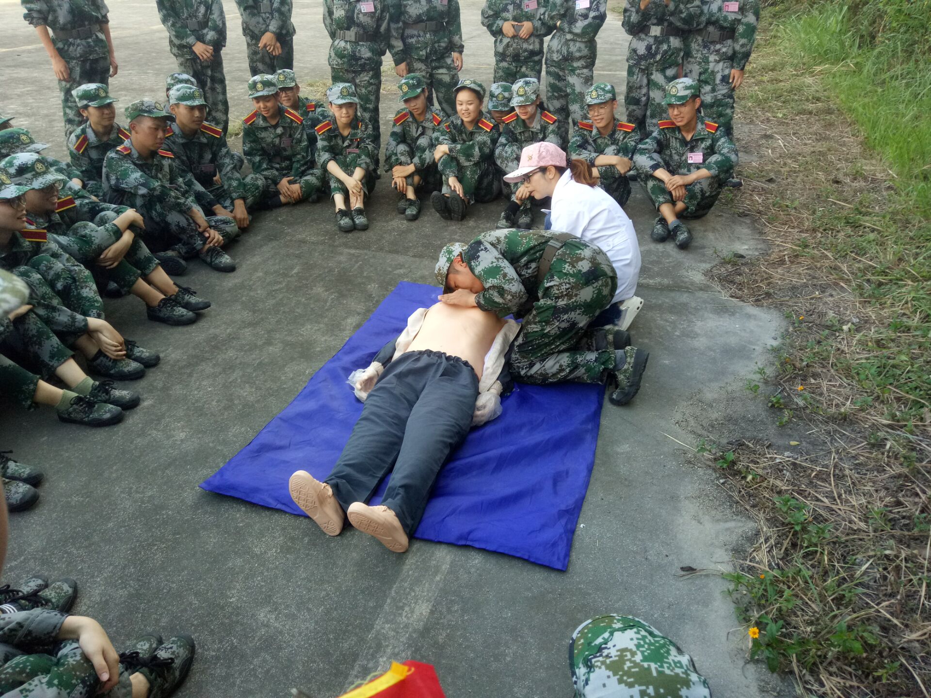 骄阳下的军训正如火如荼得向前进行着,18级新生军训已经进行了11天,烈日当空下的训练,同学们不怕苦不怕累,积极完成军训这迈进大学的第一课。绿茵茵的青草和同学们橄榄绿的迷彩军装相互辉映,教官们严格要求新生整理军容并端正军姿,不时亲自示范,并手把手纠正基本动作。