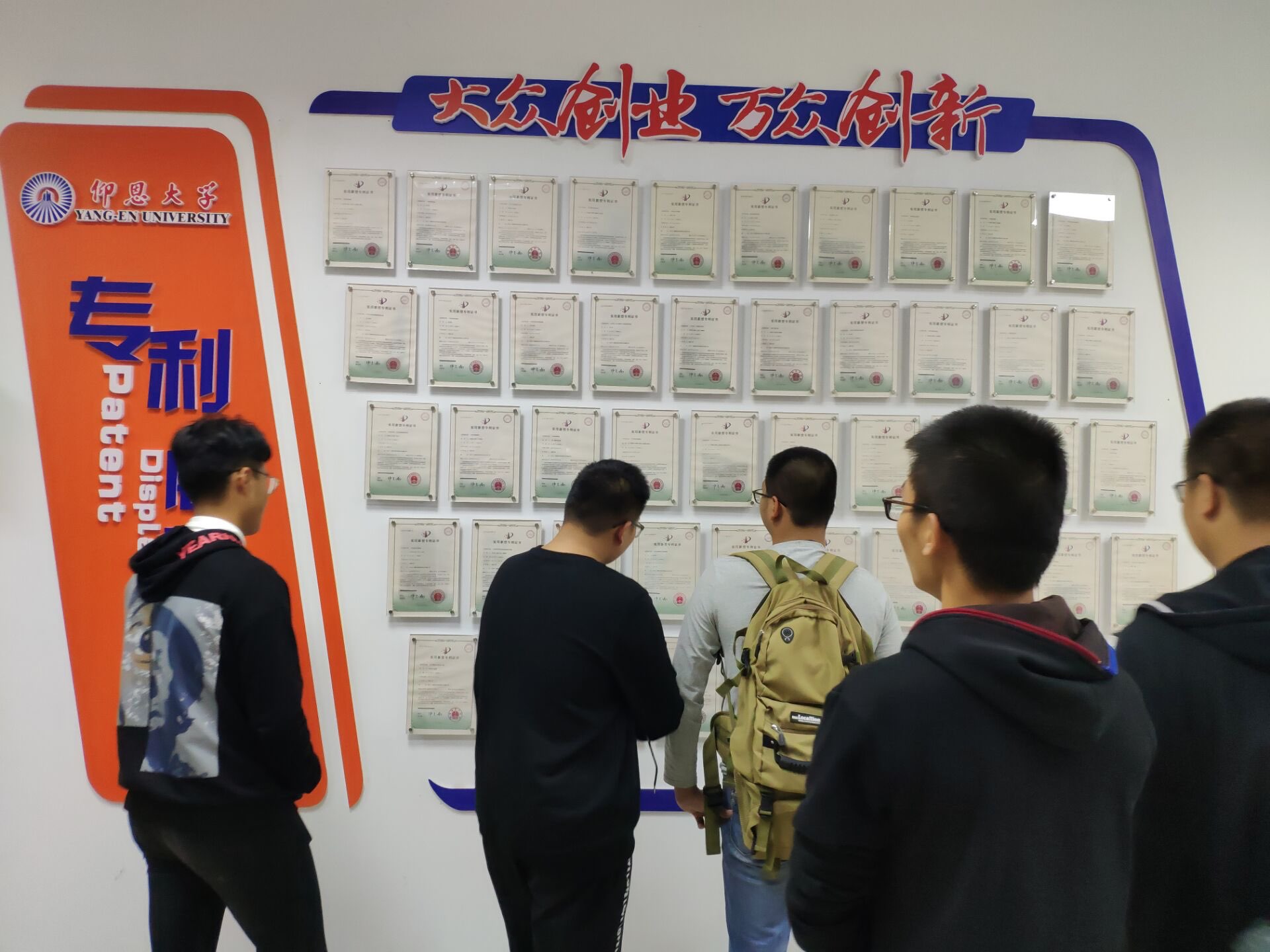 最后,解说员带领同学们参观由学校师生获得的专利组成的“专利墙”以及创意作品展,各种各样奇思妙想的作品让同学们眼界大开,而满满一墙的专利承满了仰恩大学师生在创新上获得的成就与荣耀。