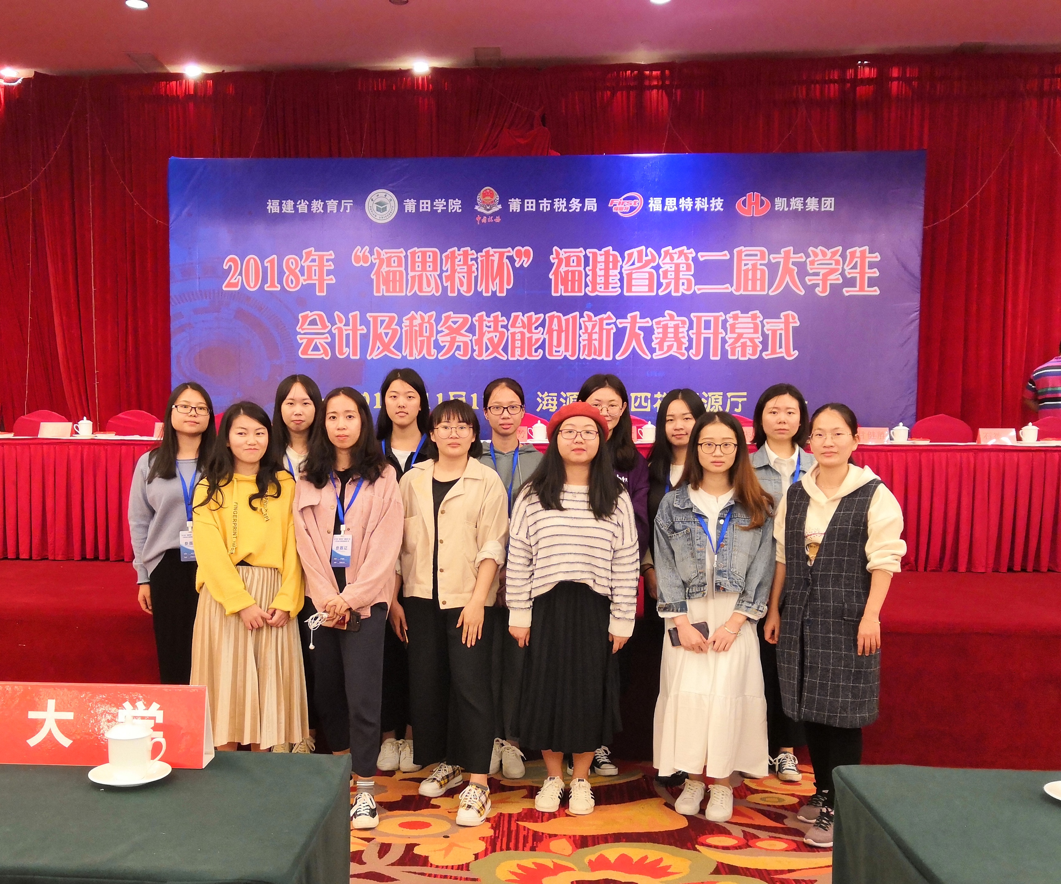 2018年“福思特杯” 第二届福建省大学生会计及税务技能大赛是由福建省教育厅主办、莆田学院与莆田市税务局联合承办。 本次比赛共吸引来自福州大学、华侨大学、福建农林大学、仰恩大学等41所院校近500名参赛选手及指导教师前往参加比赛。我校共有12名学生在林秋花老师的带领下赴赛。