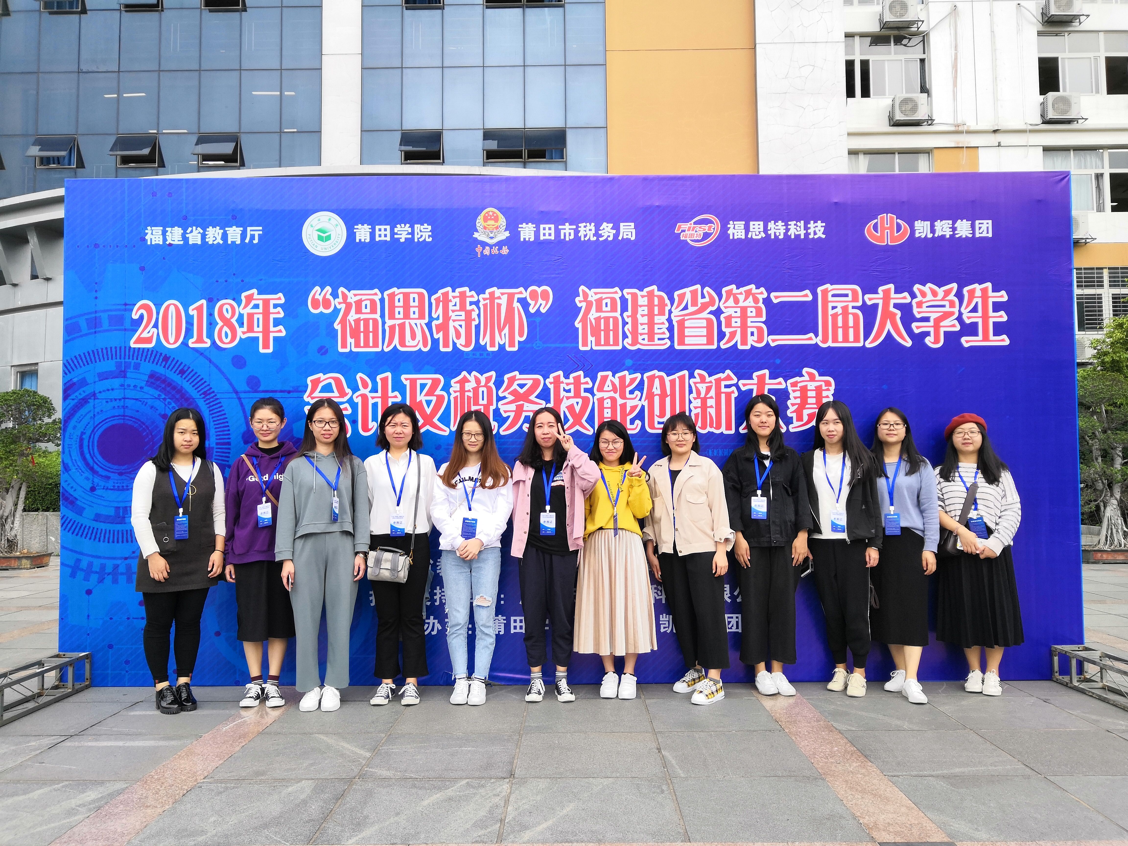 2018年“福思特杯” 第二届福建省大学生会计及税务技能大赛是由福建省教育厅主办、莆田学院与莆田市税务局联合承办。 本次比赛共吸引来自福州大学、华侨大学、福建农林大学、仰恩大学等41所院校近500名参赛选手及指导教师前往参加比赛。我校共有12名学生在林秋花老师的带领下赴赛。