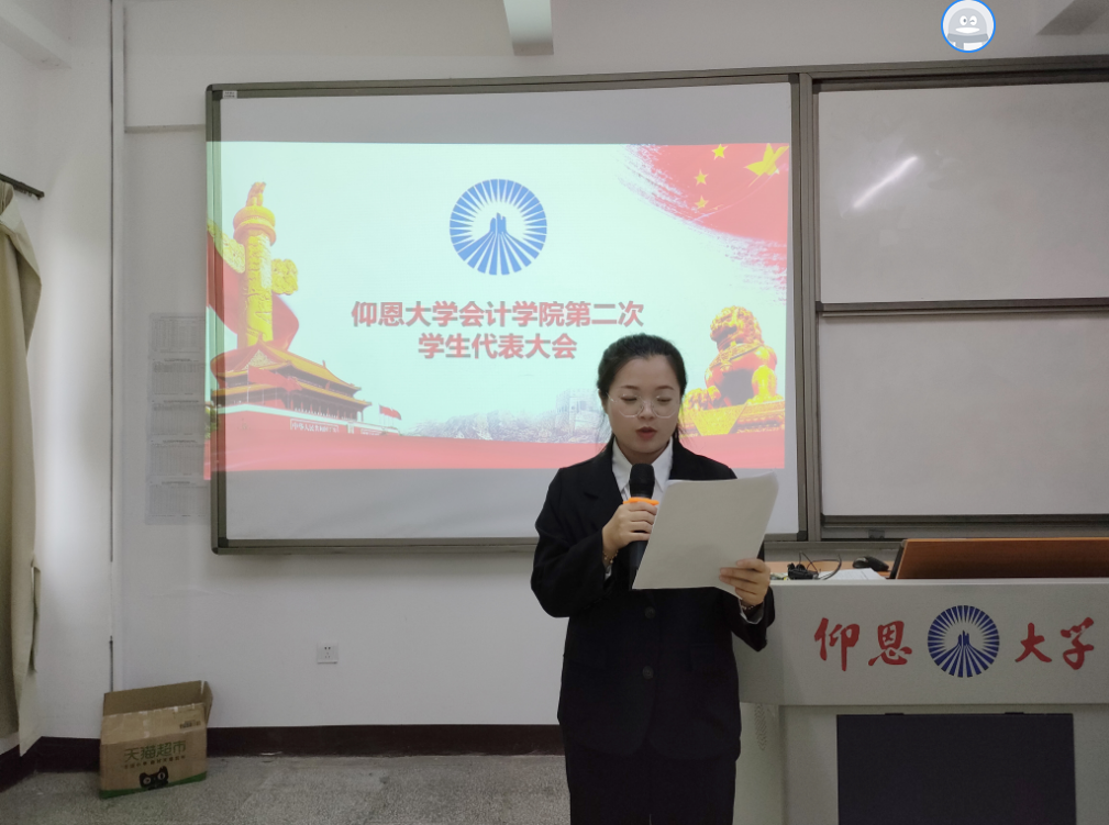 10月28日下午4:00,WilliamHill官方网站第二次学生代表大会(下面简称“学代会”)在仰恩大学第一教学区吉龙楼301和302教室召开。与会人员有WilliamHill官方网站党总支副书记吴锦霞、党总支组织委员林金狮、学生会指导老师籍潇鹏、学生会主席团成员以及学院47名学生代表,会议由学生会执行主席林文主持。