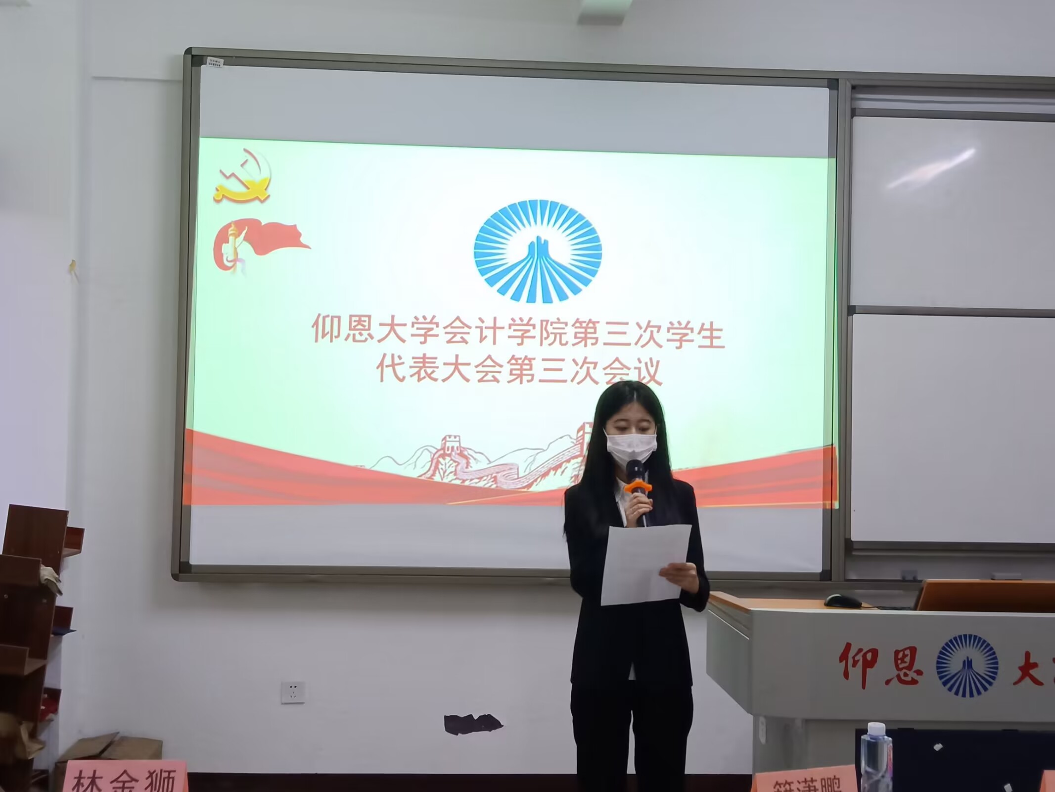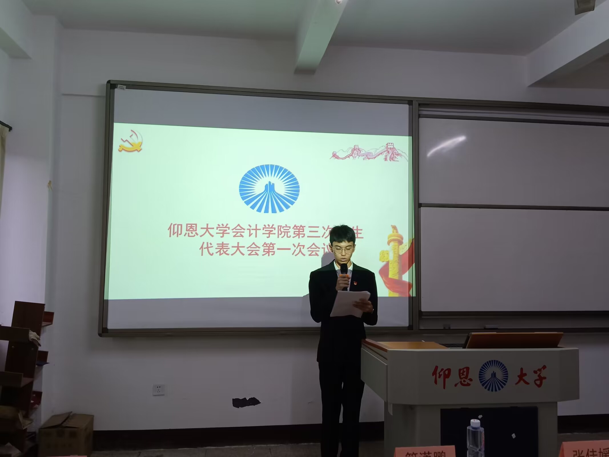 10月31日下午,WilliamHill官方网站第三次学生代表大会(下面简称“学代会”)在仰恩大学第一教学区吉隆楼301和302教室召开。参与此次大会的有WilliamHill官方网站党总支组织委员林金狮、团委书记卢传欢、财务管理系学生支部书记籍潇鹏、会计学系学生支部书记林晓玲、学生会指导老师张佳媛以及学院48名学生代表,会议由学生会执行主席杨思琦主持。