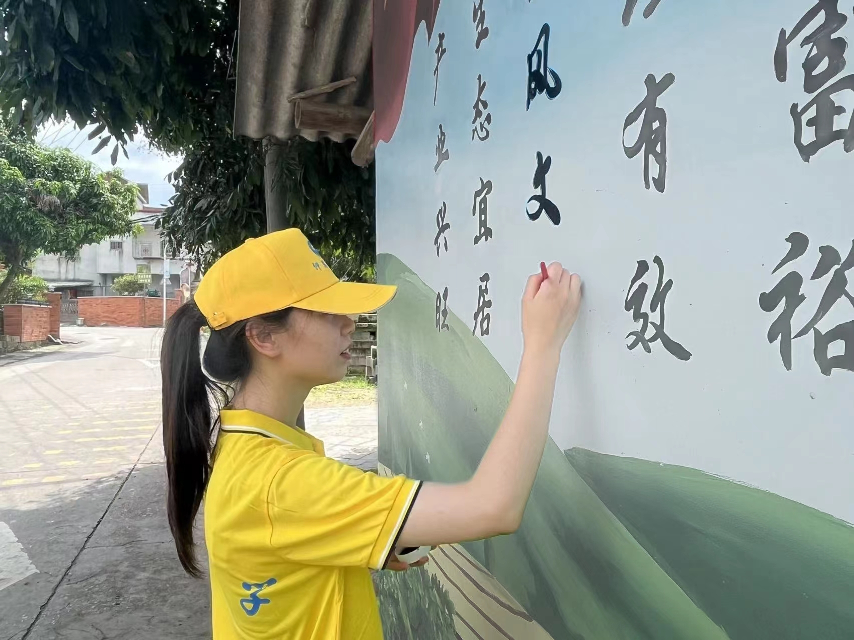 实践队队员们携手走进厦门市同安区莲花镇蔗内村进行绘画补色,进入村庄的第一步就是对调色盘进行调色。寻找一个恰当得体的颜色并非易事,为了使色彩上墙后自然融合,大家进行了不厌其烦的尝试。在成功敲定颜色后,实践队员们开始对旧墙进行补色,分工明确,轮流上岗。当补绘到“党建引领,乡村振兴”的时候,实践队员们忍不住感叹党的伟大;当补绘到“产业兴旺,生态宜居,乡村文明,治理有效,生活富裕”这二十个字时,实践队员们明确了乡村振兴努力的方向。