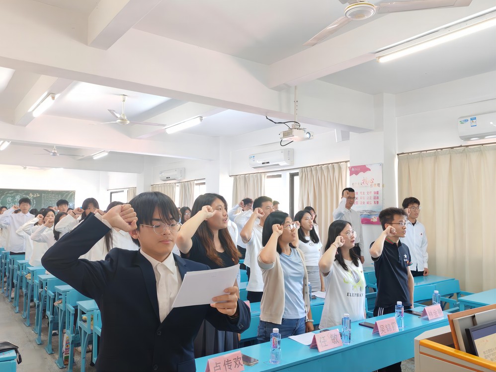 此次入团仪式在庄严的国歌声中拉开帷幕。辅导员李诗琦首先宣布了新团员名单,并由吴锦霞老师和卢传欢老师为新团员颁发团徽徽章和团员证。紧接着,在谭雄辉同学的带领下,全体新老团员进行了宣誓礼。在最后的寄语环节中,任敏老师向在场团员提出了希望与要求,其指出,不论新旧团员都要不忘入团的初心,扛起责任与义务,在班集体的学风、班风等建设中发挥力量,严于律己,不断增强班级的凝聚力与向心力。