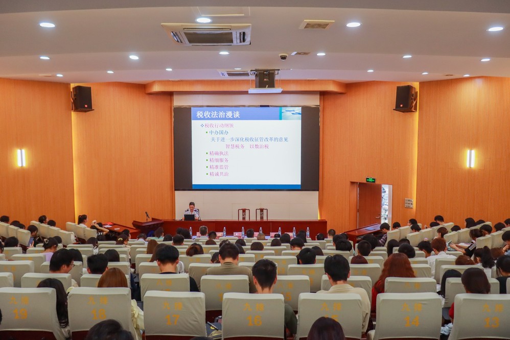 来校一行首先参观了校史馆,了解我校办学历史以及取得的办学成就。其次,三方于曼谷楼210室举行短暂的税校企洽谈会,就合作方向、合作计划等达成初步共识。最后,由万安分局詹文欣局长在第一教学区多功能报告厅开展税收法治讲座。