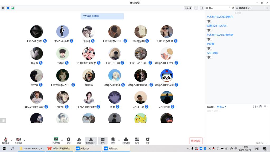 随后,土建系根据近期学生在学习和生活中存在的问题,组织召开了全体班干部线上会议,系副主任康彦青,系主任助理牛彦龙,教师兼班主任孙雨斐、刘益凡,团工委书记吴丹等老师参加了会议。首先,牛彦龙老师通报了近期学生管理教育中收集和师生反馈的问题,针对问题,对疫情期间核酸检测、健康打卡、主题教育、课外活动等工作进行进一步分工和部署。要求全体班干部担起责任,积极配合学工办、任课教师,积极为同学的学习和生活做好服务,一定要带头做好模范作用。接着,土木专升本2101班班主任孙雨斐及建环2201班班主任刘益凡依次指出了网课授课期间以及本次走访过程中发现的问题,要求全体班干部在网课期间起好带头和监督作用,一起保持良好的学习习惯,积极营造一个健康、认真的网课学习环境。最后,康彦青老师进行了发言和动员,对近期工作学习管理和生活纪律提出三点要求:一是要求班干部要尽职尽责,认真负责地做好核酸检测的督促以及监督工作,共同遵守学院疫情防控相关规定,严格做到非必要不外出,一起确保校园安全稳定。二是要求老师与学生干部监督好全体同学的学习过程,建议在网课结束后做好课后复习,对网课学习态度和行动懈怠的同学积极帮扶与教育。三是采取多种学习方法,建立学习小组,利用安静舒适的环境进行网课学习,线上线下保持同样的学习态度。
