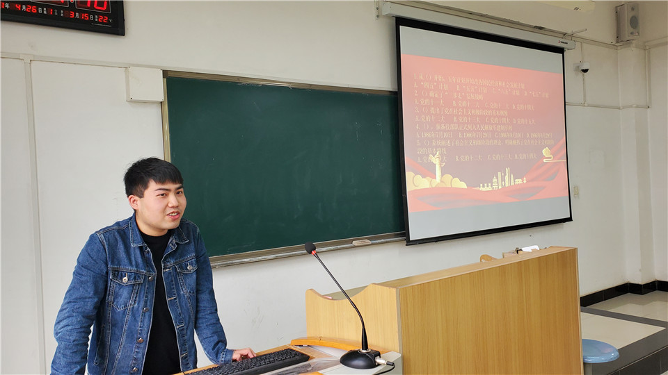 最后,支部党史第二学习小组成员苗育玮、赵萌、梁晨、任家豪等四名同学为大家进行了“学党识,知党情,做合格党员”汇报展示,四名同学严格贯彻学有所思、学有所悟、学有所得的基本学习要求,就近期的学习成果和体会与大家进行了交流和讨论,并把学习中整理出的重点知识做成考题和大家进行了问答互动。